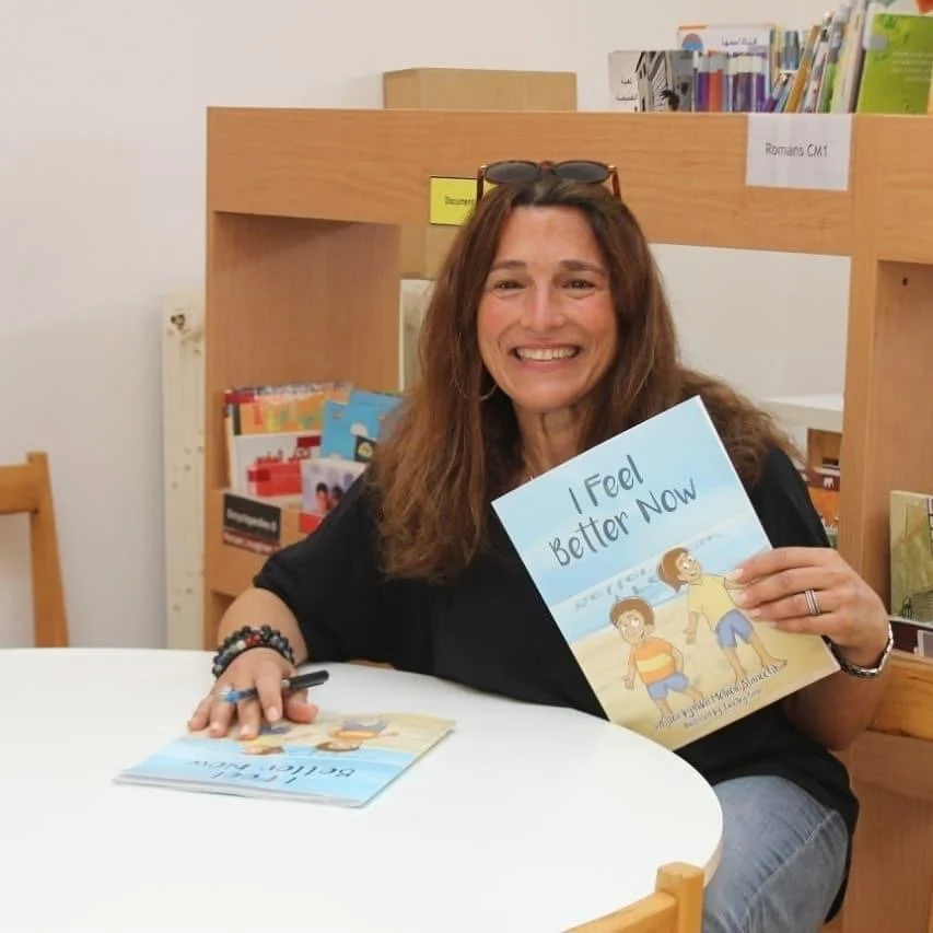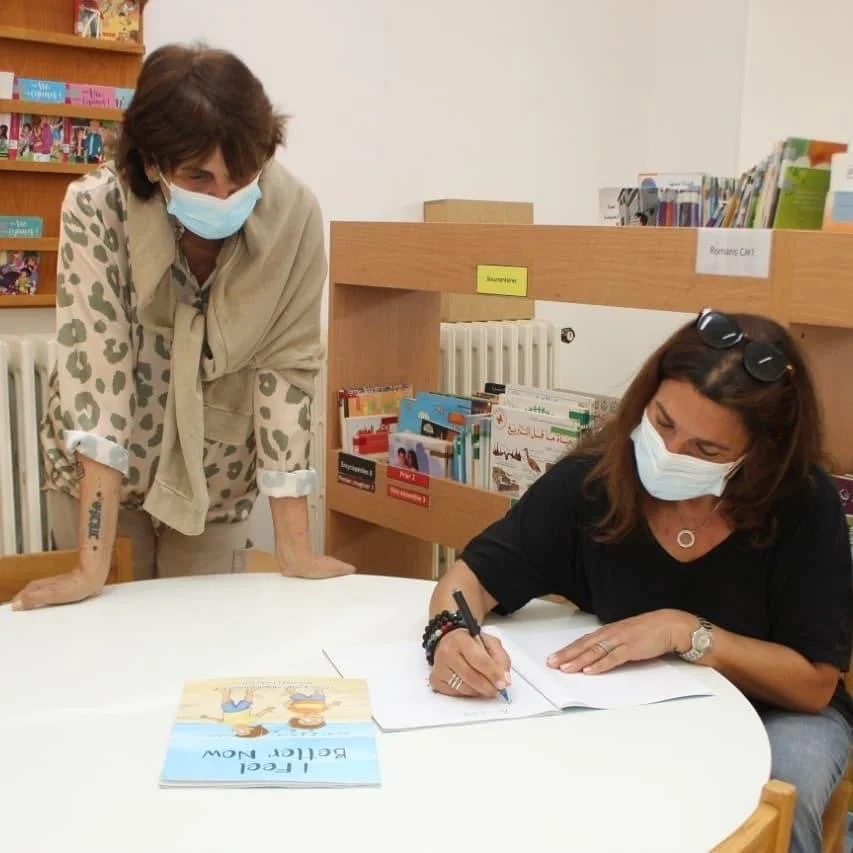 On May 12, 2021, Hiba signed copies of her book at CPF (Collège Protestant Français) in Beirut Lebanon, her high school! With her in the group picture are administration and alumni officials, and the other picture is the elementary school librarian. © Photos courtesy of Alumni Chair.