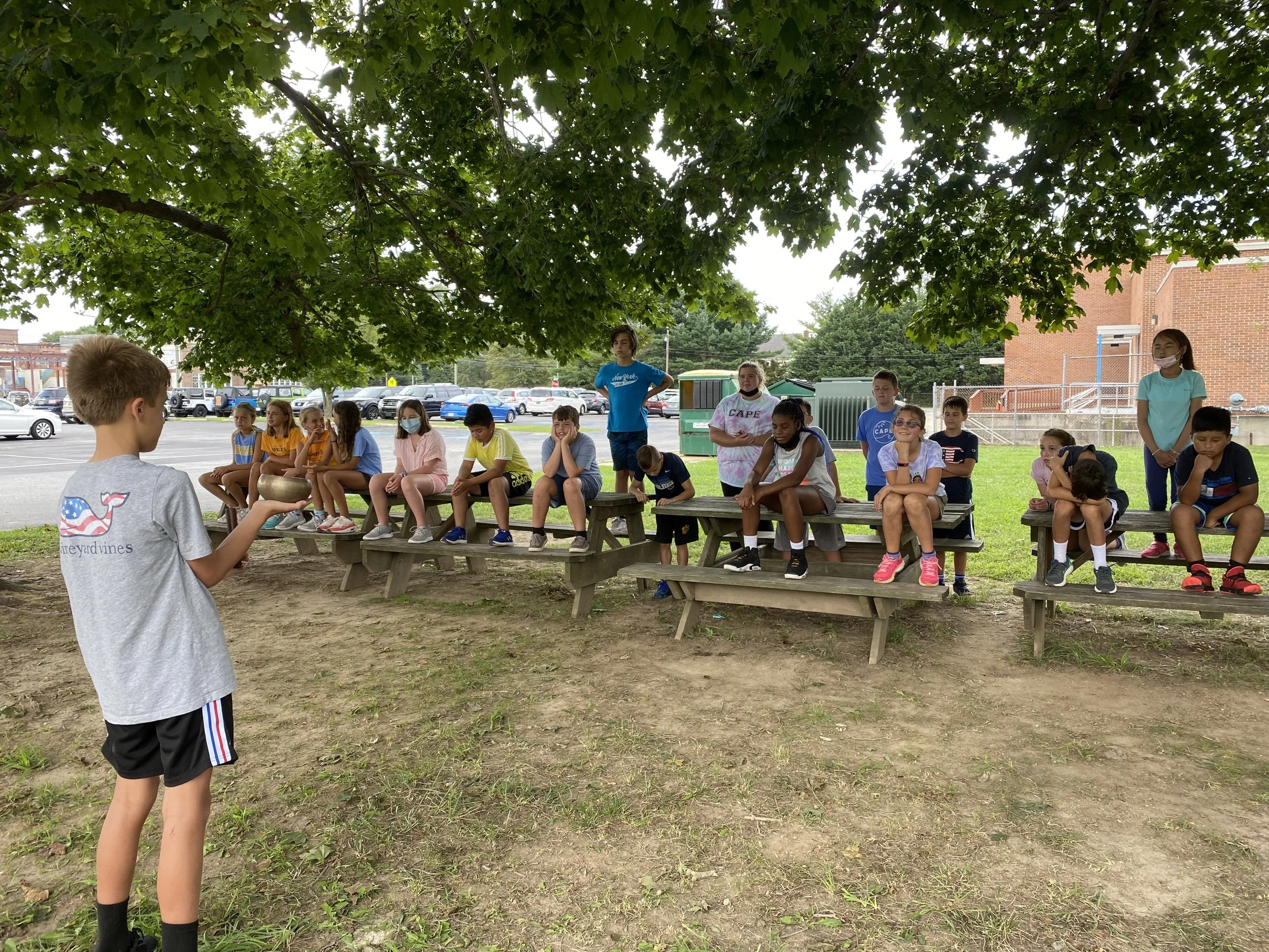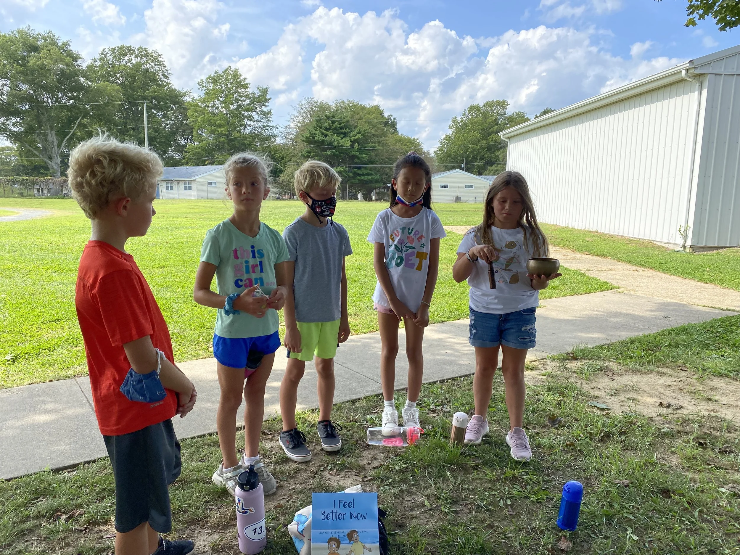 Hiba visited Shields Elementary School in Lewes, discussed I Feel Better Now, and engaged the students with some yoga and mindfulness activities. Pictured here are the children practicing mindful listening with the singing bowl.
